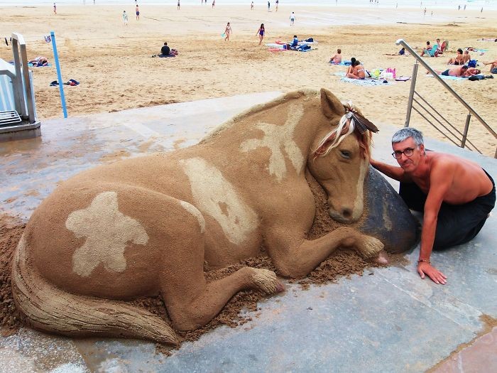 Dengan pasir tersebut ia buat seperti hewan-hewan hidup. Dari kuda, ikan hiu, ikan lumba-lumb dan masih banyak lagi. Foto: Dok. Andoni Bastarrika