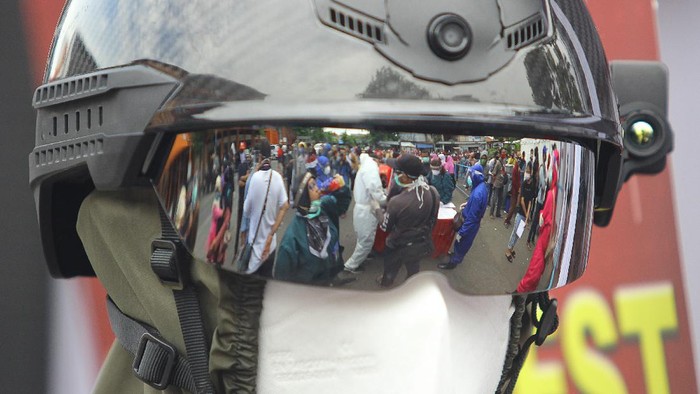 Petugas kesehatan di kawasan Surabaya, Jawa Timur, juga tampak mengenakan helm pendeteksi suhu tubuh saat penyelenggaraan rapid test massal pada Senin (1/6) lalu. ANTARA FOTO/Moch Asim.