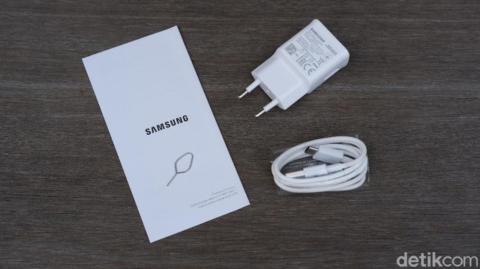 Dalam paket penjualannya hanya menyertakan charge, kabel data USB type C, buku petunjuk dan pembuka slot SIM Card. Foto: Adi Fida Rahman/detikINET