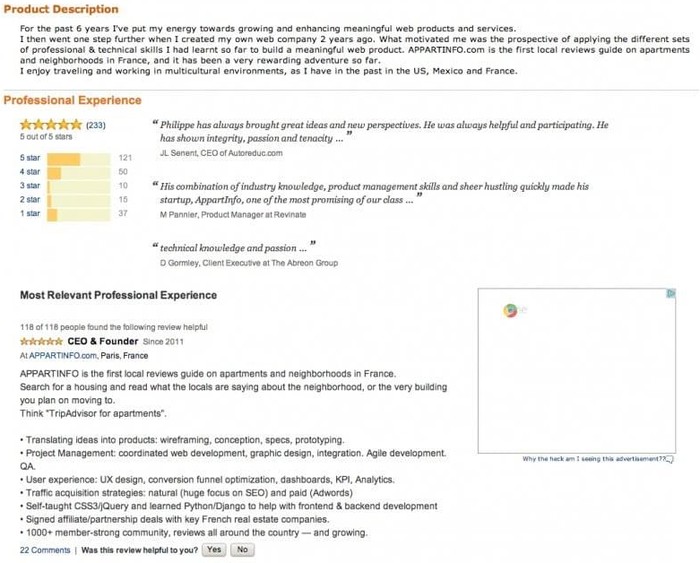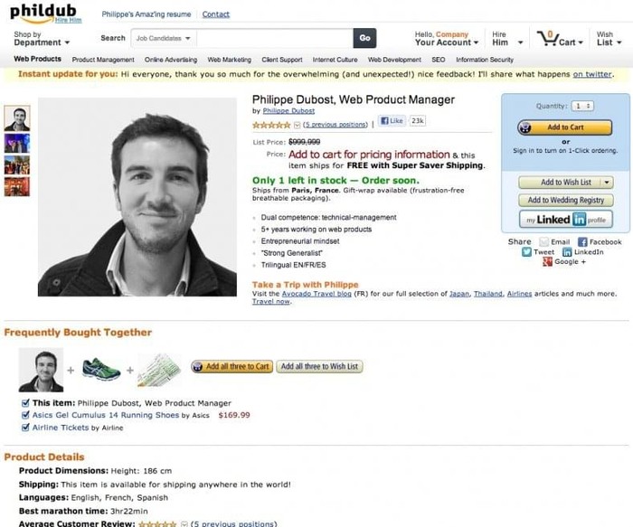 Seorang Web Product Manager, Philippe Dubost membuat resume mirip tampilan laman Amazon. Foto: Philippe Dubost via Social Talent