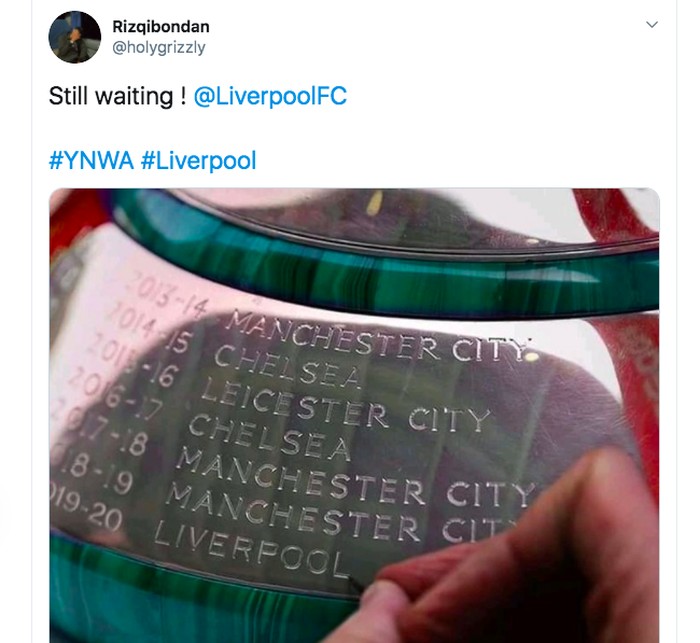 Para fans Liverpool langsung gembira begitu ada yang menyebut-nyebut soal titel Liga Inggris karena mereka sudah begitu dekat. Foto: Twitter