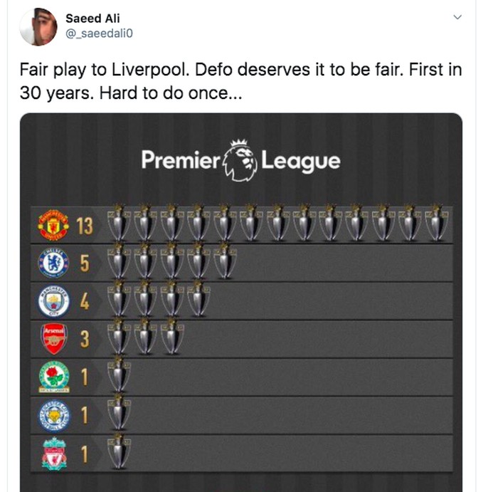 Namun memang dalam format Premier League, Liverpool baru sekali ini juara. Foto: Twitter