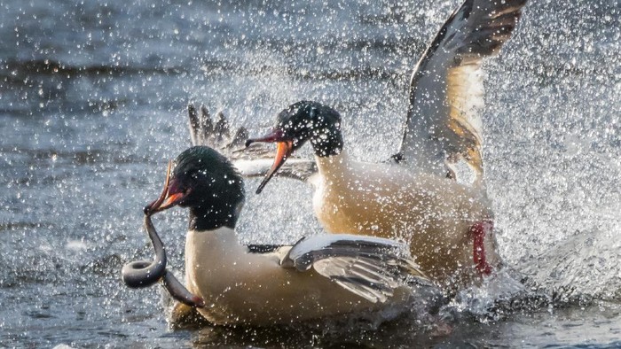 Dua ekor bebek berebut sea lamprey dari Sungai Connecticut. Burung pemakan ikan dan bebek adalah predator ikan vampir ini. (Getty Images/iStockphoto)