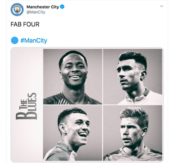Akun Manchester City memuji keempat pemain yang mencetak gol ke gawang Liverpool. Foto: Twitter