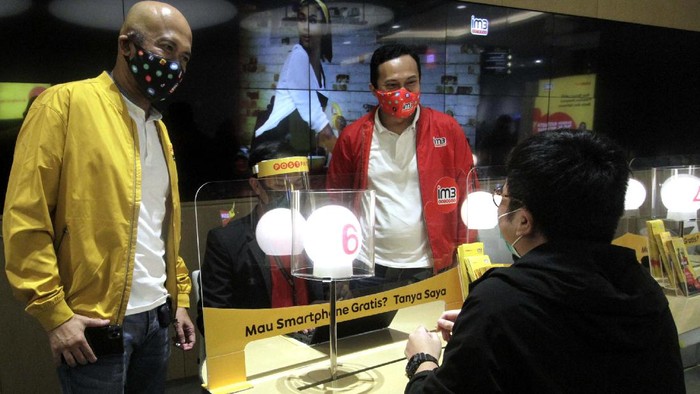 M. Andre Reinaldy H, Senior VP - Head of Retail & Device Management Indosat Ooredoo bersama dengan SVP Head of Region Jabotabek, Edi Riyanto, saat berbincang kepada pelanggan di gerai Indosat Ooredoo di Mall Kota Kasablanka, di Jakarta, Kamis (2/6/2020).