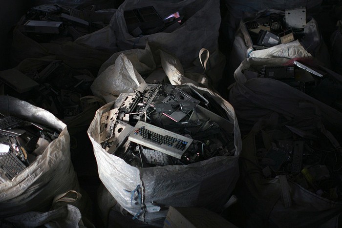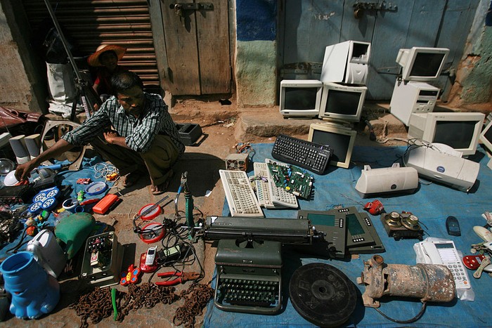 Limbah elektronik ini terdiri dari ponsel, komputer, perangkat elektronik rumah, dan bermacam perangkat elektronik lain. Hanya 17% dari total limbah elektronik itu yang berhasil didaur ulang, sementara sisanya dibuang ke tempat pembuangan akhir limbah, dibakar, atau dihilangkan dengan berbagai cara. Kevin Frayer/Getty Images Β