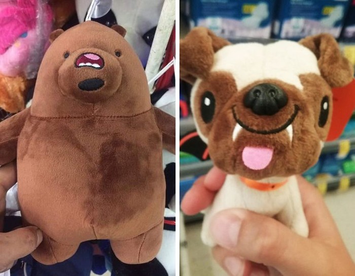 Mainan anak yang salah posisi penempatan nih, si beruang mulutnya di atas hidung sedangkan si anjing ada lidah di bagian dagunya. (Foto: Brightside)