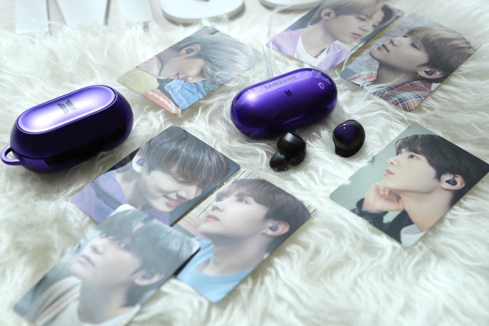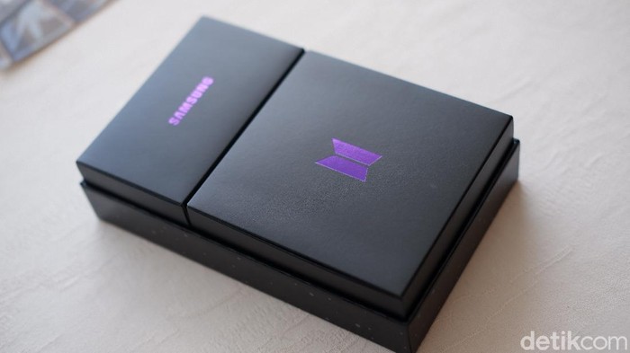 Kota pertama berisikan case Galaxy Buds+ yang dibuat berwarna ungu metalik. Ada tulisan Samsung dan logo BTS. Foto: Adi Fida Rahman/detikINET