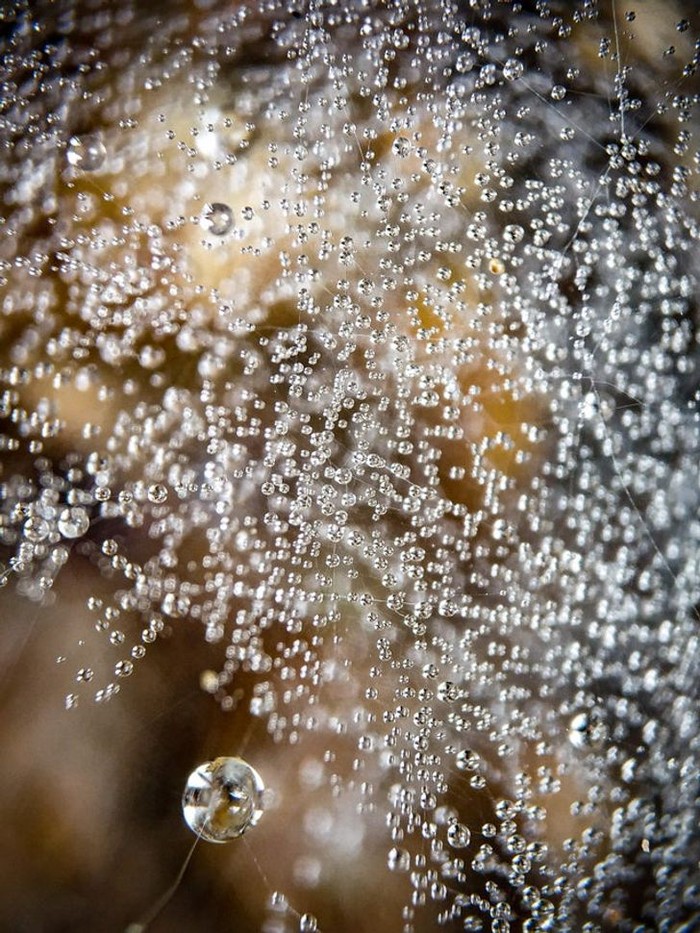Ribuan tetesan air kecil di jaring laba-laba. (Foto: Brightside)