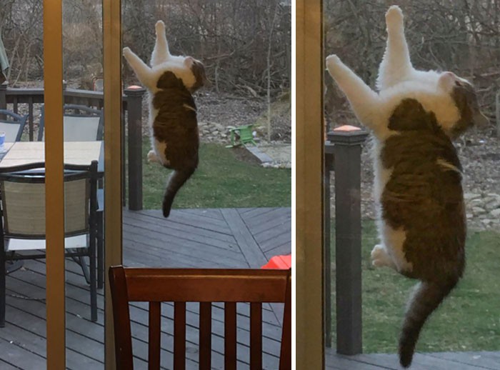 Kucing gendut ini terhimpit di antara dua pintu kaca. Foto: Bored Panda