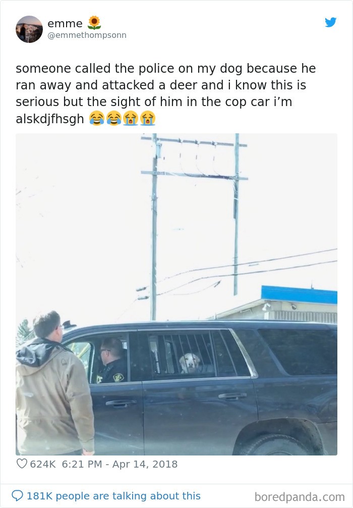 Anjing ini ditahan polisi setelah kabur dan menyerang seekor rusa. Ekspresinya saat berada di mobil polisi sungguh kocak. Foto: Bored Panda