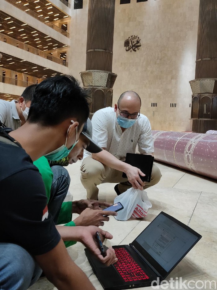 Karpet baru sedang dipasang. Masjid Istiqlal jadi lebih terang. Hal itu rupanya adalah hasil dari teknologi tata cahaya terbaru yang disebut Smart Lighting (Fitraya Ramadhanny/detikcom)