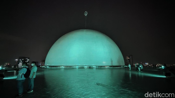 Kubah luar Masjid Istiqlal memakai konsep cahaya bulan. Ada 20 lampu LED RGB 100 watt di sekeliling kubah (Fitraya Ramadhanny/detikcom)