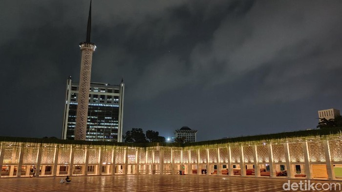 Suasana pelataran Masjid Istiqlal dan menaranya dengan temaram tata cahaya yang semakin cantik (Fitraya Ramadhanny/detikcom)
