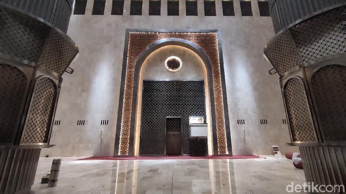Dinding mihrab Masjid Itqlal. Tampak marmernya dibersihkan jadi makin kinclong dan bersih (Fitraya Ramadhanny/detikcom)