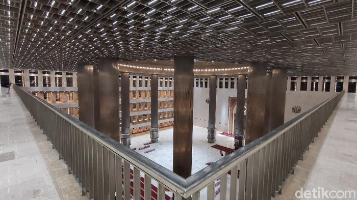 Di ruang utama void Masjid Istiqlal kini dipasang 300 titik lampu utama dan 3.300 titik lampu ambiens. Inilah suasananya dari lantai 5 (Fitraya Ramadhanny/detikcom)
