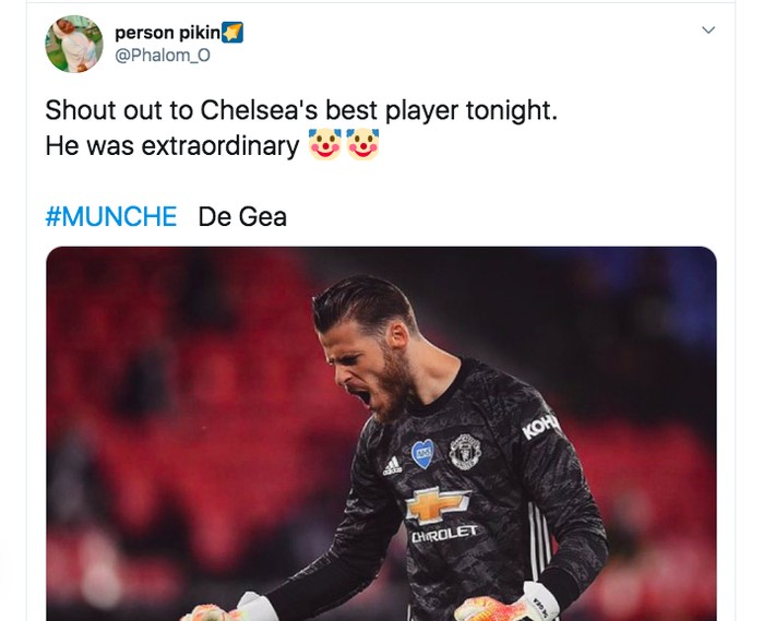 Sponsor Chelsea dan nomor kostum De Gea adalah skor pertandingan semalam. Foto: istimewa