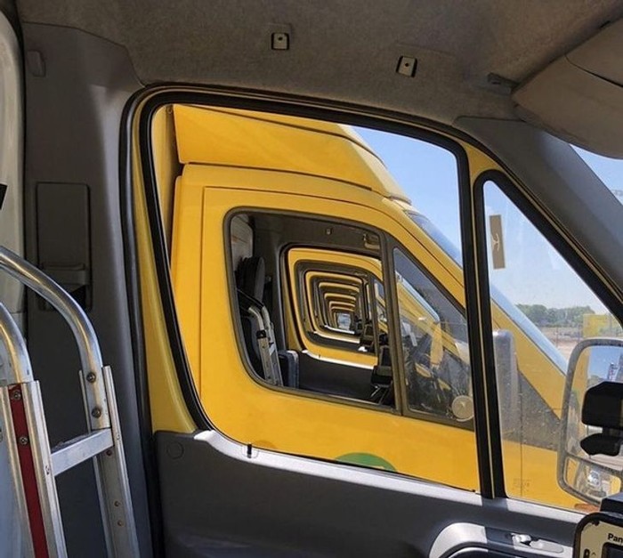 Deretan bus dari samping yang tampak simetris. (Foto: Brightside)