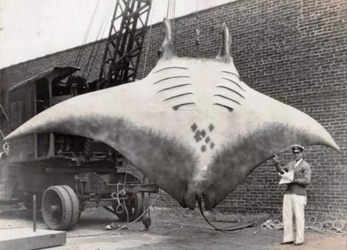 Foto ini menimbulkan pro kontra memperdebatkan apakah pari raksasa ini sungguhan atau tidak. Namun sumber foto menyebutkan, foto ini merupakan jepretan A.L. Khan pada tahun 1935. Saat ditemukan, pari seberat 2.267 kg ini cukup membuat takut warga sekitar berenang lagi.Β Foto: via Daily Forest