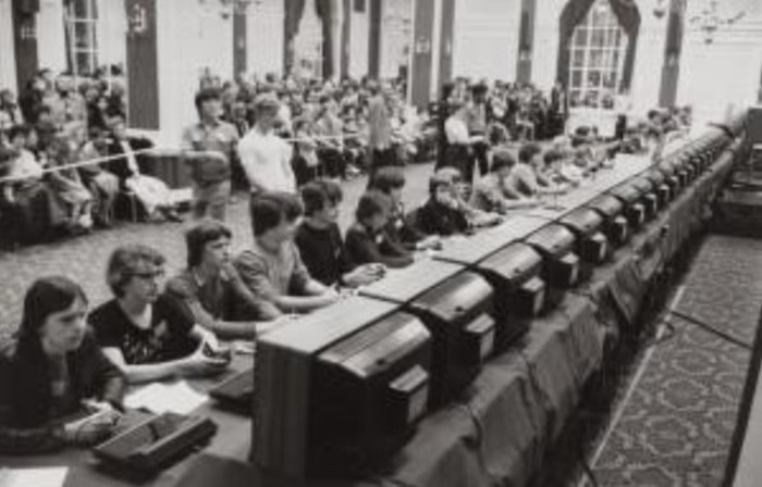 Zaman sekarang kita bisa mabar game dari ponsel dengan orang lain di belahan Bumi lain. Nah, ini adalah gambaran mabar pakai komputer di tahun 1980. Saat itu digelar National Space Invaders Championship yang dihadiri lebih dari 10.000 peserta. Foto: via Daily Forest