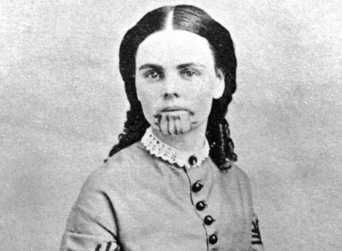 Seorang gadis bernama Olive Ann Oatman diculik bersama saudara perempuannya oleh suku asli Amerika saat berusia 14 tahun. Dia diadopsi kepala Mohave dan tumbuh dengan suku tersebut. Bekas asuhannya antara lain tato di dagunya. Bertahun-tahun kemudian tersebar berita tentang seorang gadis kulit putih yang hidup dengan sebuah suku. Akhirnya dia berhasil kembali ke keluarganya dengan tebusan selimut dan kuda. Foto: via Daily Forest