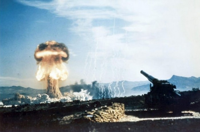Jika kalian kebetulan berada di lokasi uji coba nuklir Nevada pada masa ketika foto ini diambil, kalian mungkin tidak akan bisa melarikan diri dari ledakan ini. Dari titik ledakan ke kamera yang mengambil gambar tersebut, terasa gelombang kejut yang punya kecepatan 16 milidetik. Foto: via Daily Forest
