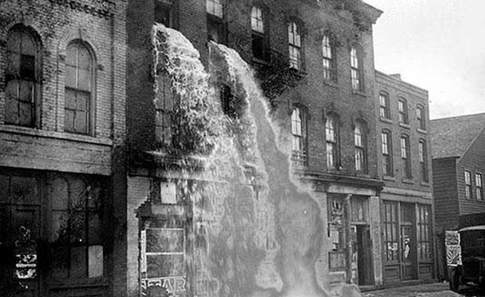 Kucuran seperti air terjun ini merupakan bir. Foto ini memperlihatkan peristiwa ketika polisi menemukan tempat pembuatan bir palsu di Detroit, AS. Polisi menembaknya hingga bir mengucur deras keluar gedung seperti air terjun.Β Foto: via Daily Forest