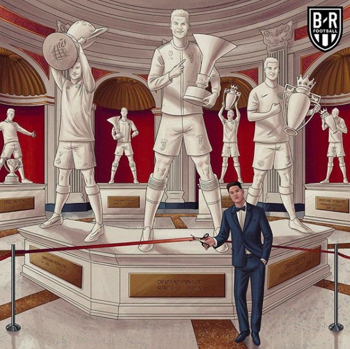 Ronaldo digambarkan berada di museum dengan patung dirinya mengangkat banyak trofi. Foto: Twitter