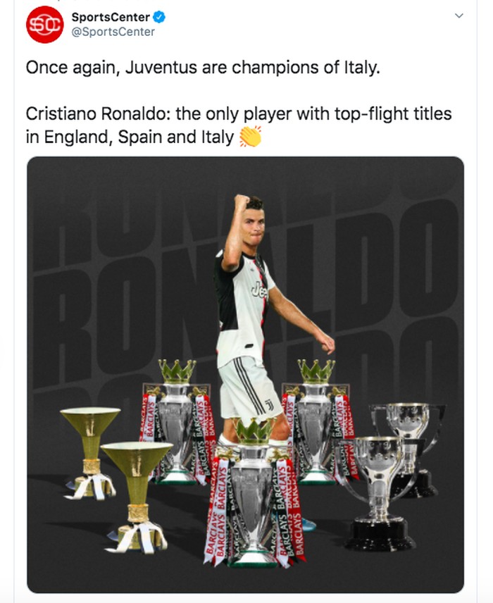 Ronaldo telah juara di tiga liga bergengsi dunia, Liga Inggris, Liga Spanyol dan Liga Italia. Foto: Twitter