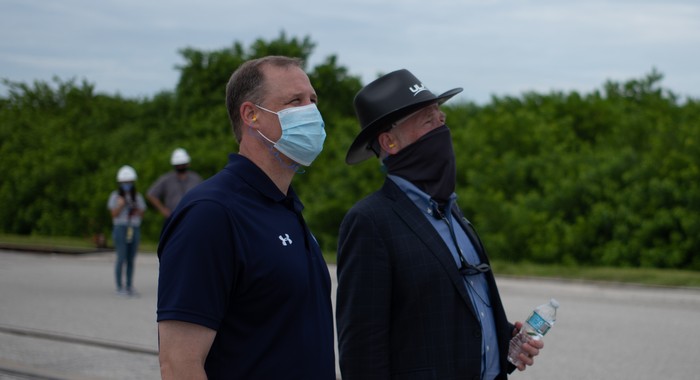 Administrator NASA Jim Bridenstine (kiri) bersama Presiden dan CEO United Launch Alliance Tony Bruno sambil memakai masker menyaksikan pemindahan roket Atlas V dari Vertical Integration Facility menuju landasan peluncuran. Foto:Β NASA/Joel Kowsky