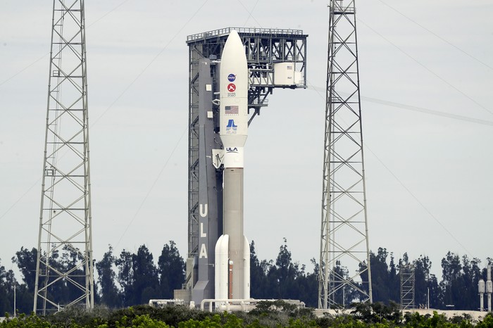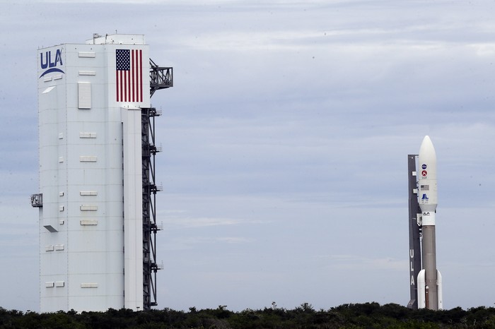 Roket Atlas V sudah berada di landasan peluncuran. Cuaca sepertinya mendukung jadwal peluncuran ini, dengan kemungkinan cuaca buruk hanya 20%. Foto: AP/John Raoux