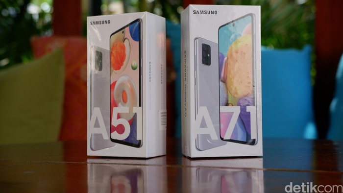 Keduanya masih mengusung panel Super AMOLED. Galaxy A51 (kiri) berukuran 6,5 inch, sedangkan Galaxy A71 (kanan) punya bentangan 6,7 inch. Foto: Adi Fida Rahman/detikINET