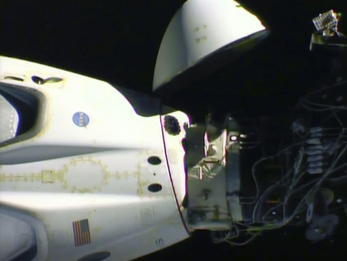 Momen setelah kapsul Crew Dragon terpisah dari ISS. Pada pukul 13.51 waktu setempat, kapsul membuang 'belalainya' yang berisi energi, panas, dan sistem lainnya. Selang beberapa waktu melontarkan pendorongnya untuk bermanuver sendiri ke orbit dan lintasan yang tepat untuk pendaratan. Foto:Β NASA via AP