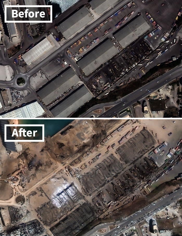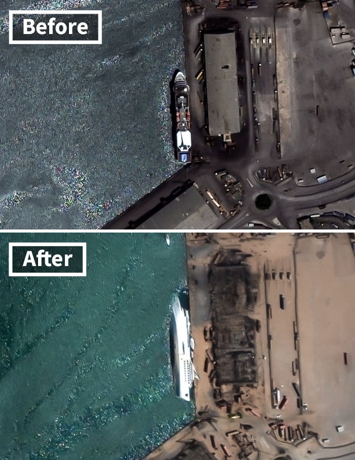 European Space Imaging telah merilis beberapa gambar satelit tentang keadaan sebelum dan sesudah ledakan, yang menunjukkan seberapa besar kerusakan yang disebabkan ledakan tersebut di sekitarnya. Foto: European Space Imaging via Bored Panda