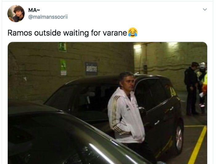 Ramos sedang menanti Varane di parkiran. Sebenarnya jelas ini foto Mourinho, namanya juga meme. Foto: Twitter