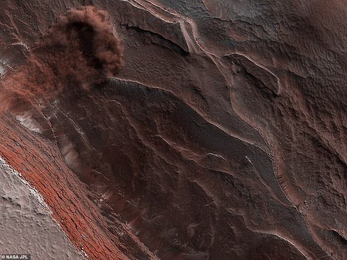 Jepretan yang mengabadikan longsoran es di Mars. Es musiman di Mars menguap pada musim semi dan tebing es setinggi 500 meter itu mulai berjatuhan. Foto: NASA