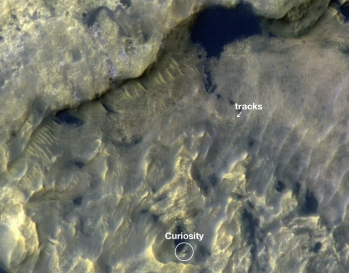 Wahana Mars Reconnaissance Orbiter juga memantau rover yang sedang lalu lalang di Mars, termasuk jalur perjalanan Curiosity ini.Β Foto: NASA