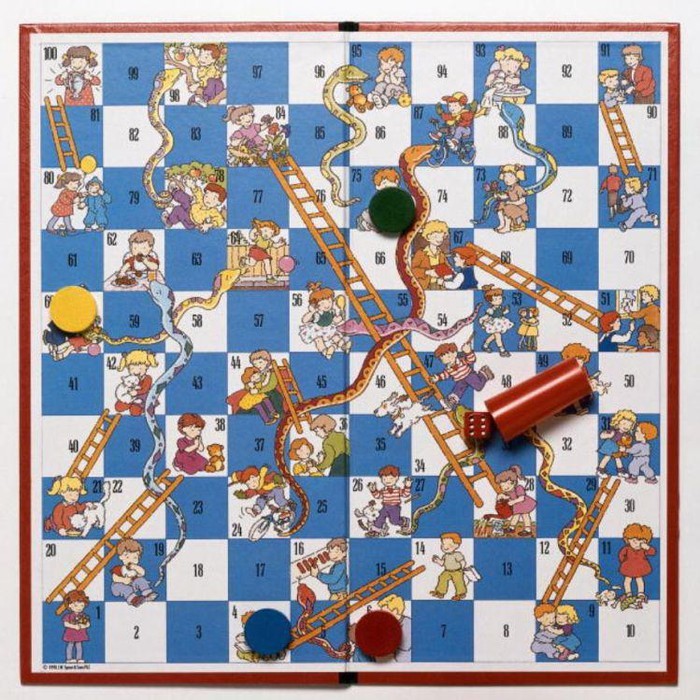 Ular tangga merupakan permainan mengasyikkan di mana tujuan utamanya adalah mencapai garis finish dengan dadu, akan tetapi banyak rintangannya yang membuat pemain bisa mundur jauh sekali, padahal sudah berada di depan. Sangat mengasyikkan walau mungkin generasi masa kini mulai tak mengenalnya.Foto: istimewa