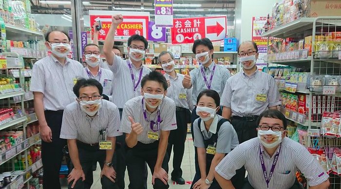 Masker ini sepertinya berhasil memberikan efek ramah dengan menampilkan senyum manis dari para pegawai. Foto: Takeya.co.jp via Bored Panda