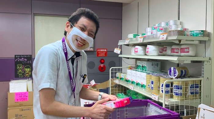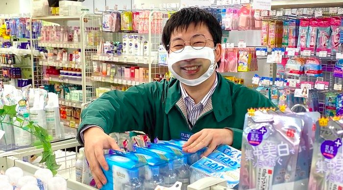 Pegawai di sebuah toko di Jepang, Takeya, memakai masker yang unik -- berbentuk senyuman. Foto: Takeya.co.jp via Bored Panda