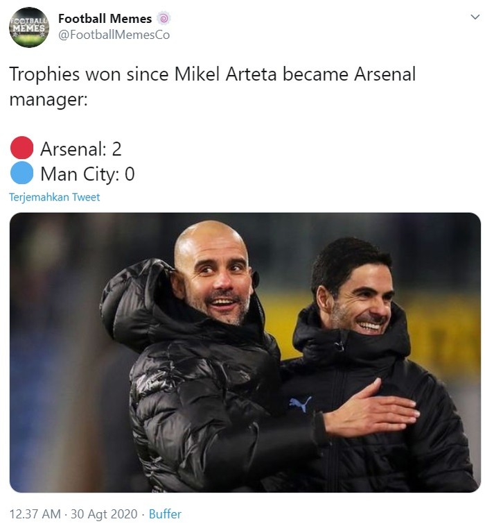 FotoINET Meme Liverpool Gagal Juara, Arsenal Kembali Angkat Trofi Pool - detikInet Minggu, 30 Agu 2020 09:42 WIB Tautan telah disalin Jakarta - Arsenal menjuarai Community Shield setelah mengalahkan Liverpool. Meme kocak Liverpool gagal juara pun bertebaran di media sosial. Liverpool tak segarang musim sebelumnya jadi bahan meme netizen. Foto: Istimewa Ketangguhan Liverpool setelah juara Liga Inggris 2019-2020 tak bertaji saat melawan Arsenal. Foto: Istimewa Skuat Liverpool sesungguhnya. Foto: Istimewa Rhian Brewster yang gagal mengeksekusi pinalti jadi bahan olokan. Foto: Istimewa Liverpool diibaratkan Thanos di musim sebelumnya, sekarang? Foto: Istimewa Liverpool keok di tangah Arsenal dalam perebutan Community Shield. Foto: Istimewa Berkat tangan magis Mikel Arteta yang membawa Arsenal berjaya. Foto: Istimewa Padahal, Arteta belum lama menangani Arsenal. Foto: Istimewa Dalam delapan bulan, Arteta mampu membawa dua trofi ke dalam kabinet Arsenal. Foto: Istimewa Foto: Istimewa (/) TAGS liverpool arsenal meme fotoinet LIHAT LAINNYA Tautan telah disalin