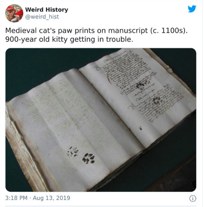 Gemesin banget ya ada tanda cinta dari si kucing yang tercetak di manuskrip kuno ini. Foto: weird_hist via Bored Panda