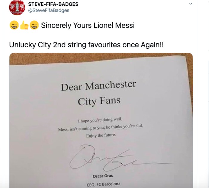 Meme surat CEO Barcelona pada Manchester City bahwa Messi tetap bertahan karena menganggap City klub yang buruk. Foto: istimewa