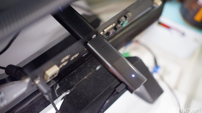 Pengguna hanya perlu menancapkan Mi TV Stick ke port HDMI di TV. Atau pada TV tabung bisa menggunakan converter AV Rca to HDMI. Foto: Adi Fida Rahman/detikINET