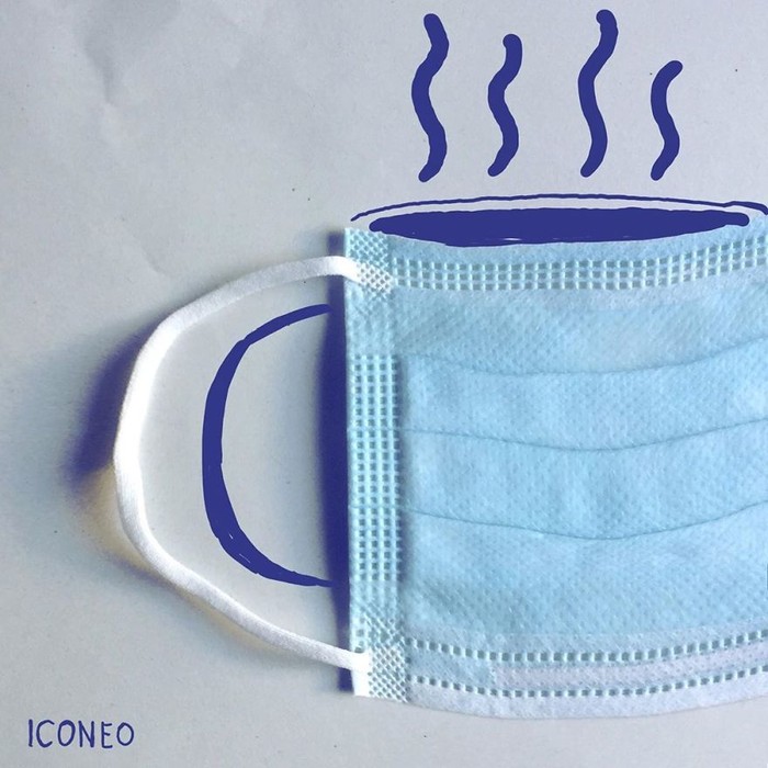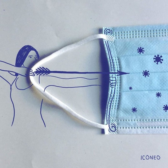 Tak hanya menggunakan media masker, ia juga membuat ilustrasi yang menggambarkan keadaan dunia saat ini. Foto: Instagram/iconeo