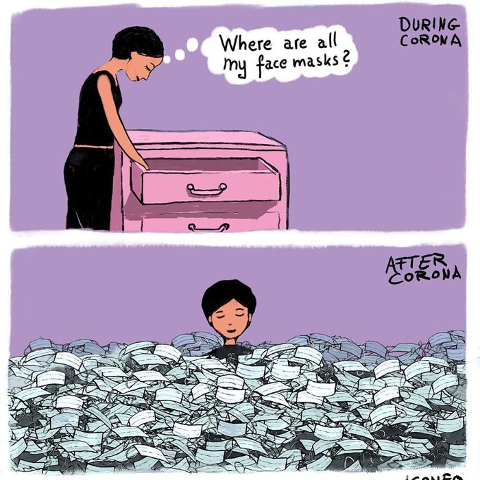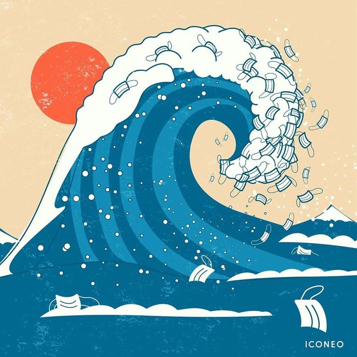 Dalam beberapa ilustrasinya ia fokus pada masalah yang ditimbulkan dari masker ini sepeti limbah pemakaikan masker sekali pakai. Foto: Instagram/iconeo