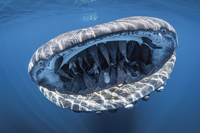 Evans Baudin memenangkan Grand Prize kontes foto ini. Fotonya menampilkan 50 ekor ikan remora yang menumpang di mulut hiu paus. Foto: Evans Baudin/Underwater Photo Contest 2020