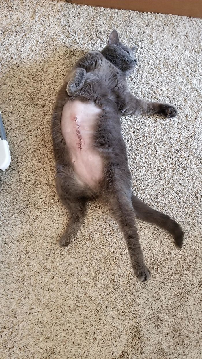 Kucing ini dicukur perutnya. Kucing sering merasakan kecemasan di klinik dokter hewan karena aneka aroma dan suara baru seperti gonggongan anjing dan kucing mengeong. Foto: Boredpanda