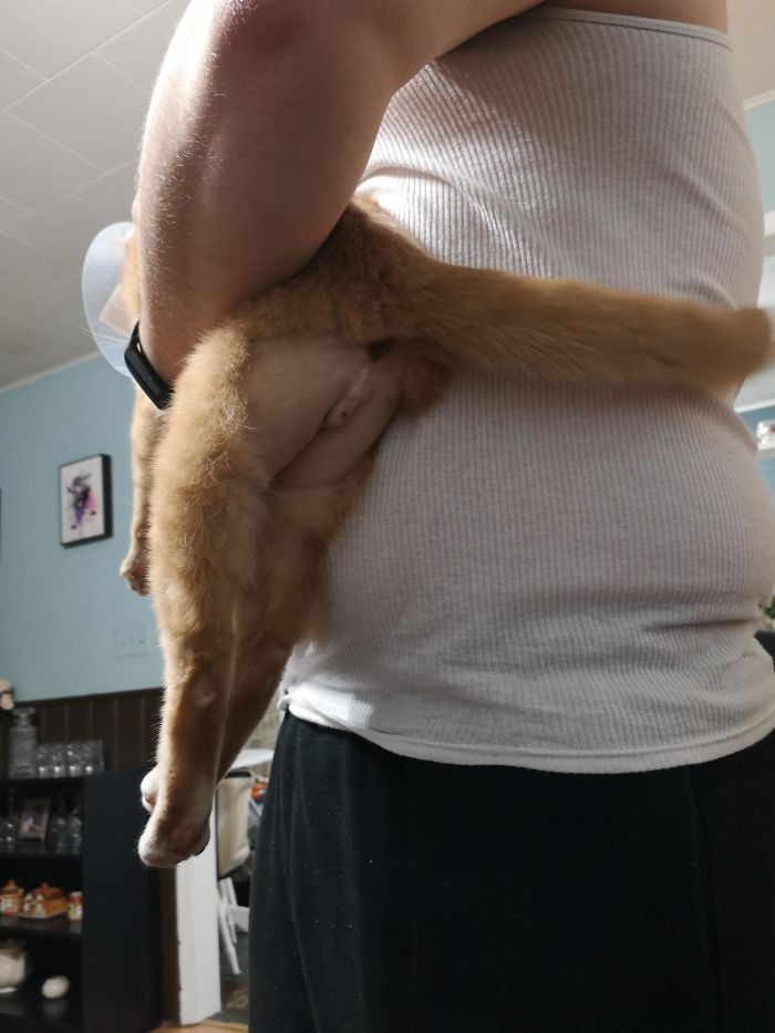 Kucing ini dicukur pantat dan buntutnya. Kucing terbiasa berdiam lama di rumah, biasanya mereka dibawa dalam kotak saat pergi ke klinik dokter hewan. Foto: Boredpanda