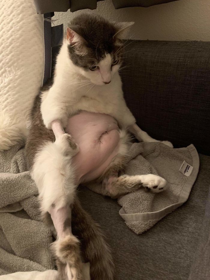 Bulu perut kucing ini dicukur habis. Kucing butuh dibawakan camilan dari rumah agar tidak terlalu kaget dengan bau di tempat perawatan (Foto: Boredpanda)